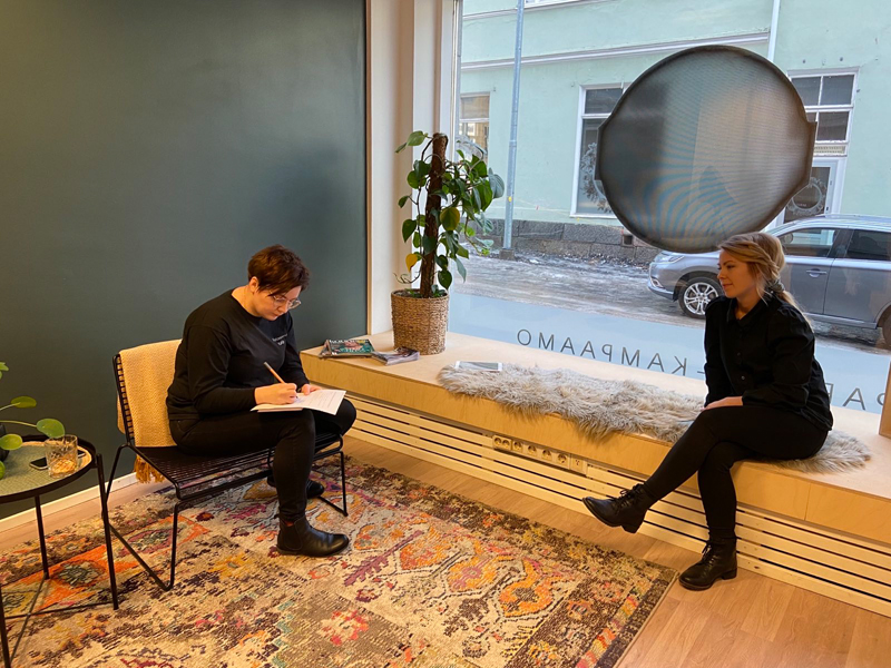 Sovimme asiakastapaamisen kampaamoon keskiviikolle 25.1.2023, joilloin paikalla olisivat kaikki kampaamon työntekijät, joita on 4 henkilöä. Leikkaamossa oli normaali työpäivä, mutta toinen omistaja, Henna, oli varannut päivän alkuun aikaa palaverille, sekä toisen tauon iltapäivällä, jolloin oli ajatus keskustella syntyneistä ideoista ja siihen mennessä hahmotellusta suunnitelmasta. Aamun palaverissa kerrattiin lyhyesti aiemmin sovitut asiat, kuten päivämäärät, sopimamme tarjous, ja jo kerrotut ideat ja toiveet. Kyselin myös tarkemmin heidän ajatuksiaan esimerkiksi videon kohdeyleisöstä ja miten heidän mielestään sen tavoittaminen videolla toteutettaisiin. Kirjoittelin ylös avainsanoja joita keskustelun aikana nousi esiin. Näistä ja muista videon esituotantoon liittyvistä yksityiskohdista kerron lisää myöhemmin osiossa videon suunnittelu/esituotanto.