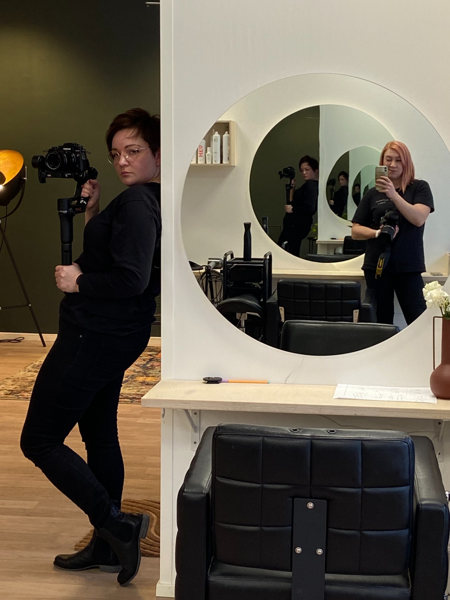 Käytin videon kuvaamiseen koululta lainattua Fujin kameraa sekä omaa gimbaaliamme. Kuvasimme otot aikalailla kuvakäsikirjoituksen mukaisessa järjestyksessä. Kuvasin lisäksi varamateriaaliksi erikoislähikuvaa sisustuksesta, kahvikoneesta, myytävistä hiustenhoitotuotteista jne. Muutaman suunniteltuun ottoon tehtiinkin pieniä muutoksia käytännön syistä, tai asiakkaan toiveesta. Esimerkiksi yksi muutos tuli siihen, missä asiakkaan hiukset käsitellään. Ajateltiin aluksi, että oltaisiin ikkunan edessä, jolloin saisimme hyödynnettyä luonnonvaloa parhaiten. Huomasimme kuitenkin käytännöllisemmäksi olla keskimmäisen peilin edessä, koska ikkunanviereset reunapeilit olivat vastakkain, ja oman kuvan/muun ylimääräisen heijastuminen peilien kautta olisi ollut tosi vaikea välttää. (vasemmalla ensimmäisessä kuvassa näkee miten peilit on sijoitettu vastakkain.)