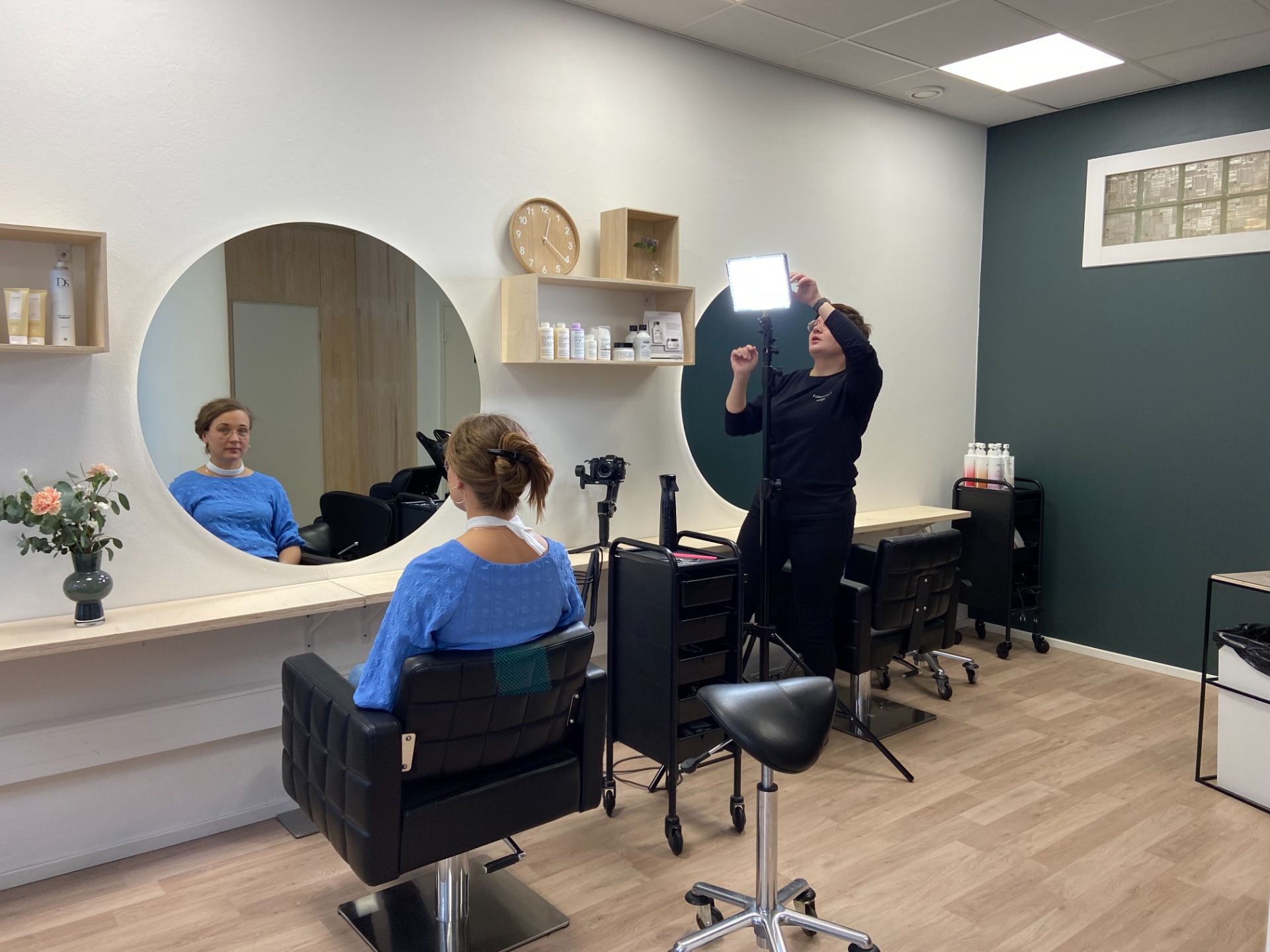 Kuvausolosuhteet oli haastavat, koska ulkoa tuli luonnonvaloa, mutta ei kuitenkaan riittävästi ainoaksi valonlähteeksi, ja kampaamossa oli jo valmiiksi kahta eri väristä valoa kattolampuissa. Otin valkotasapainon valkoisesta seinästä useamman kerran riippuen kuvauspaikasta, koska ikkunan luona valo oli sinisempää ja huoneen toisessa nurkassa taas keltaisempaa + siihen heijastui viereinen vihreä seinä. Kuvauspäivä kaikkineen oli hämärä, ja käytimme ledpaneeleita lisänä. Näiden valon pyrimme säätäämään vastaamaan mahdollisimman tarkasti katossa olevia valaisimia.