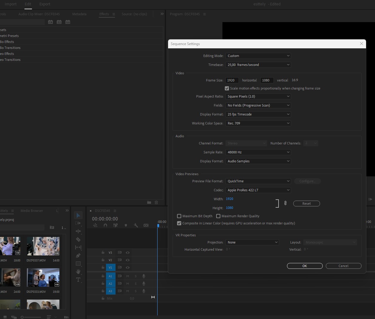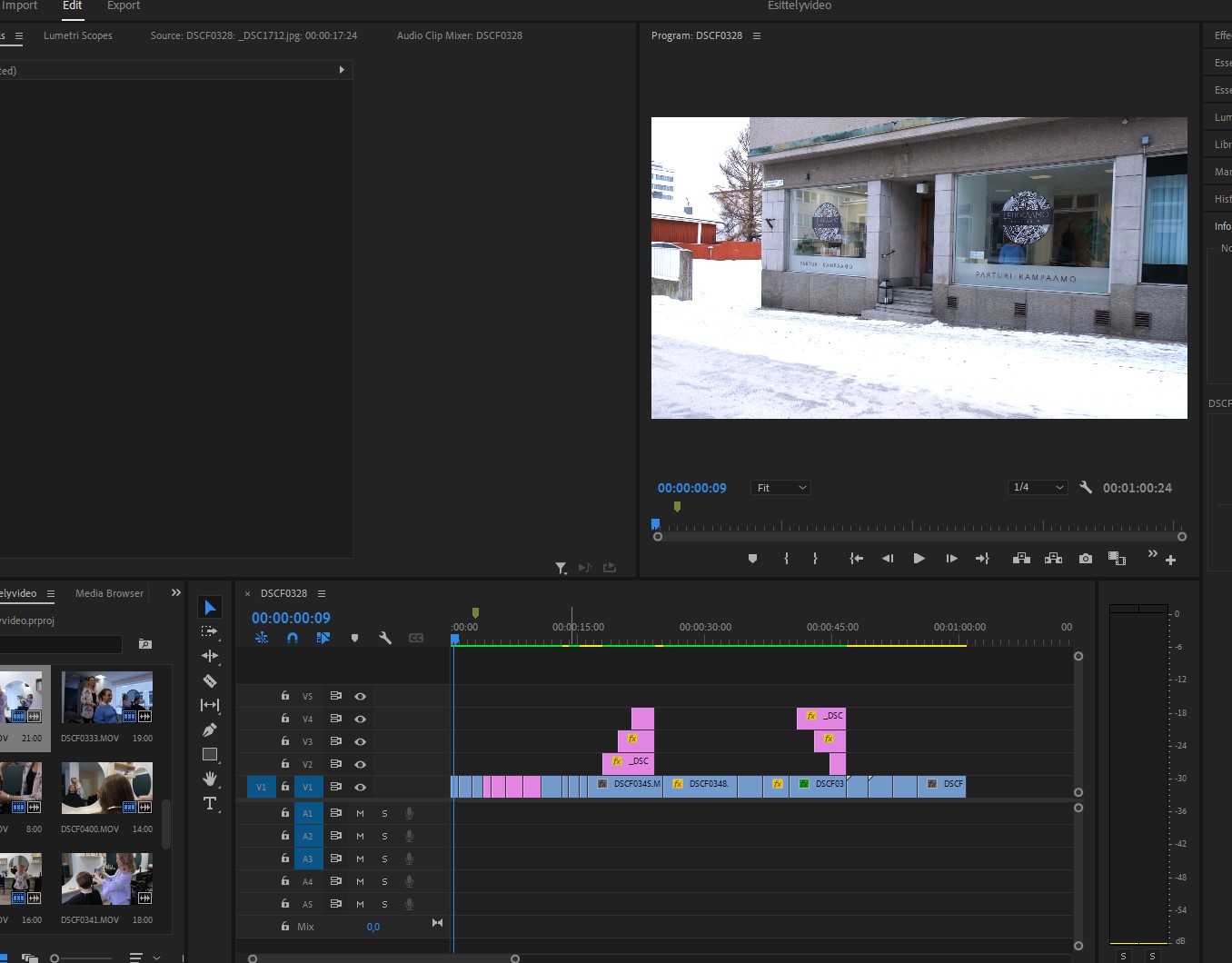 Editointi: Käytän ediointiin Adobe Premiere Prota. Aluksi tsekkasin että projektin asetukset vastaa kuvauksessa käyttämiäni asetuksia frameraten ja muiden kohdalta. Ongelmatilanteissa apuna oli google, YouTube, Laura ja av - tuotannon kurssin opettaja. (Ei välttämättä aina tässä järjestyksessä)