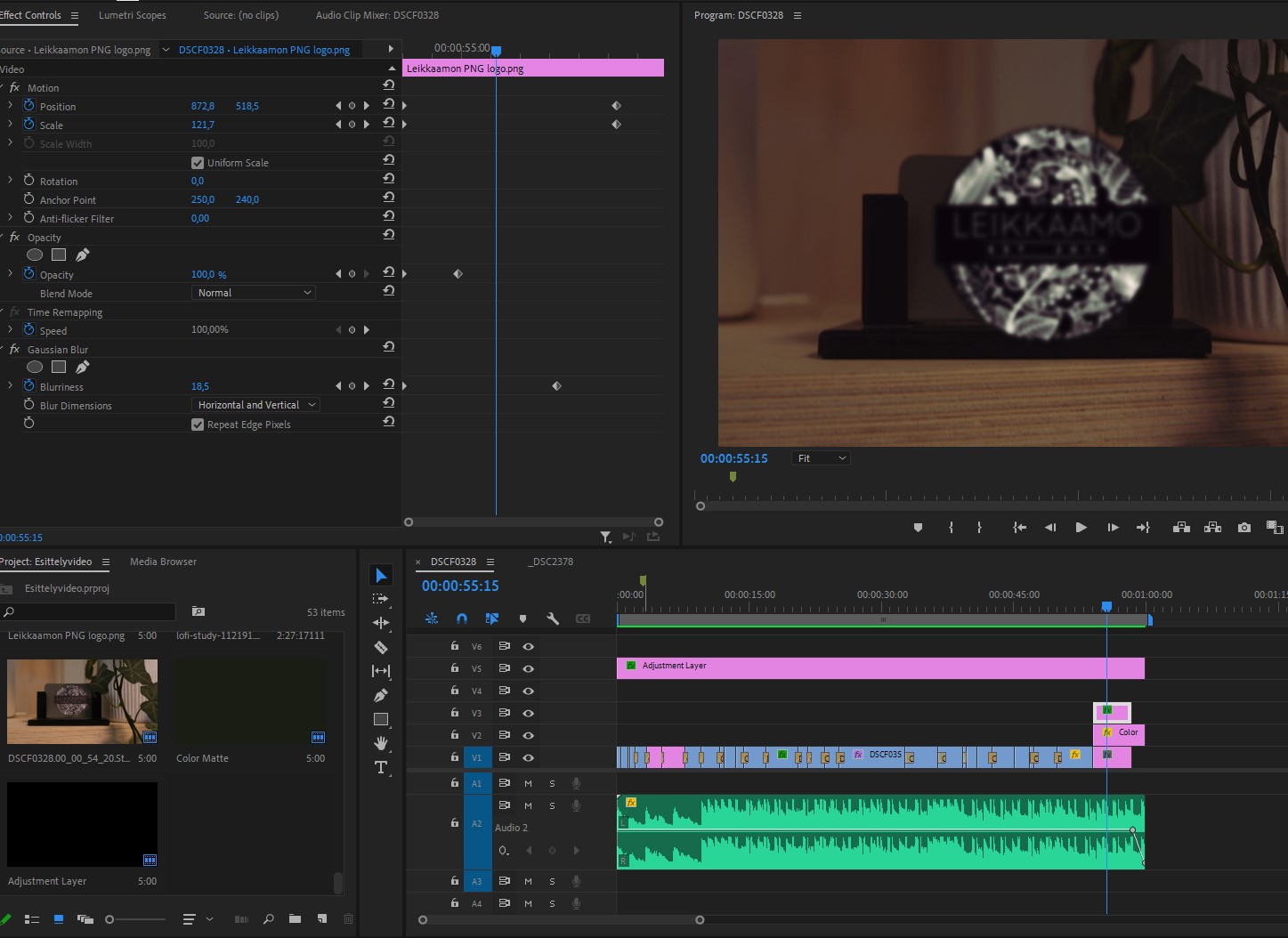 Bonushomma: Asiakkaan kanssa oli sovittu, että videon loppuun tulisi leikkaamon logo, ja asiakas lähetti tämän PNG - tiedostona. Kun avasin kuvan, absoluuttinen värisilmäni kertoi heti, että nyt ei ole kyllä värit kohdallaan. Varmistin vielä Hennalta että Leikkaamon logon pitäisi olla musta, ja kun sain vahvistuksen epäilykselleni, kävin photarissa tekemässä PNG - kuvalle tarvittavat säädöt, että sain värit kohdalleen. Käytännössä konvertoin sen mustavalkoiseksi ja lisäsin kontrastia, en muokannut logoa muuten.