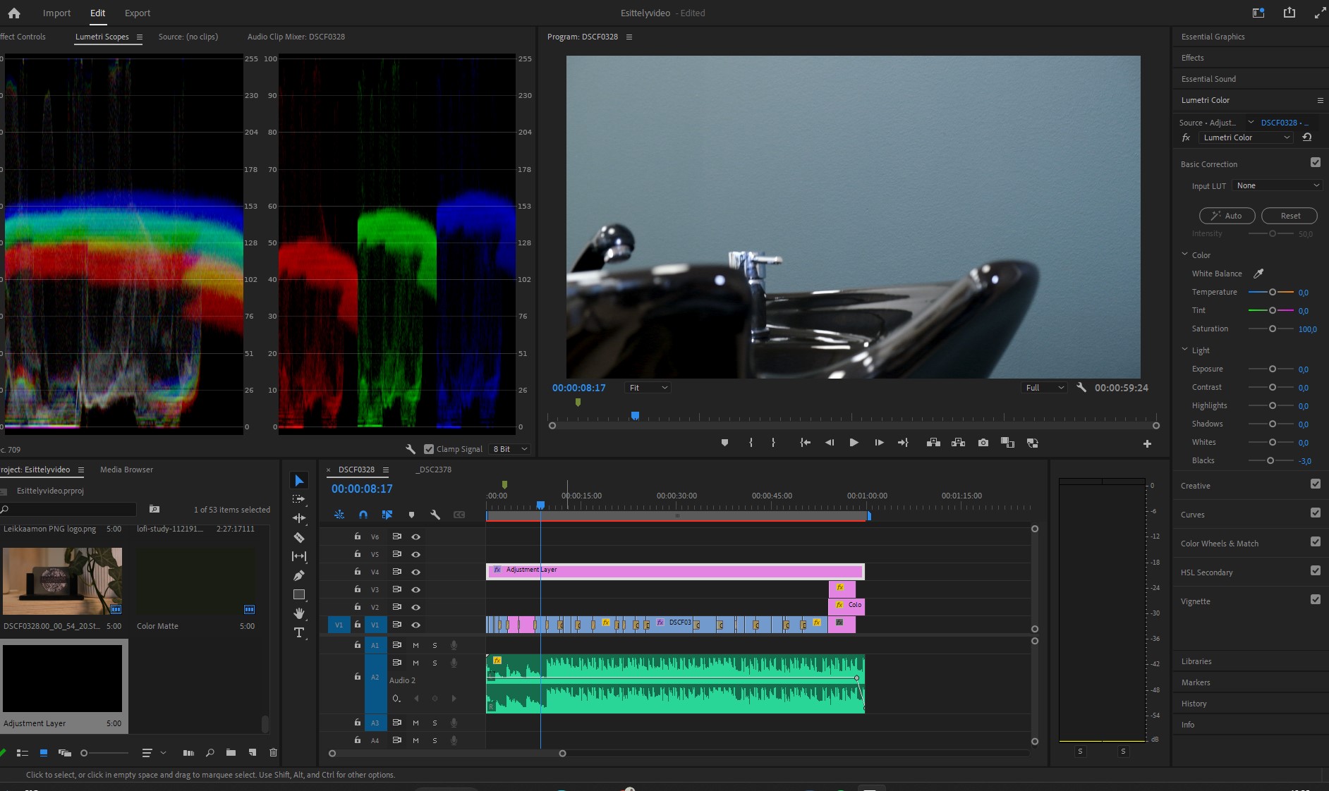 Tein videoon siirtymät ja tahdistin sitä musiikkiin. Latasin netistä ilmaisen presetin, jonka lisäsin uudelle adjustment layerille (säätötasolle) ja tein siihen tarvittavat säädöt. Tähän katsoin apua youtube - videolta ja adoben nettisivuilta, ja vastoin kaikkia omia odotuksiani sain presetin toimimaan. Säätötason idea on muuttaa videon sävyjä ihan hitusen lämpimämpään suuntaan. Latasin youtubeen asiakkaalle valittavaksi molemmat videot, säätötasolla ja ilman. (Asiakkaan valitsema video löytyy näyttöselostuksen lopusta.)