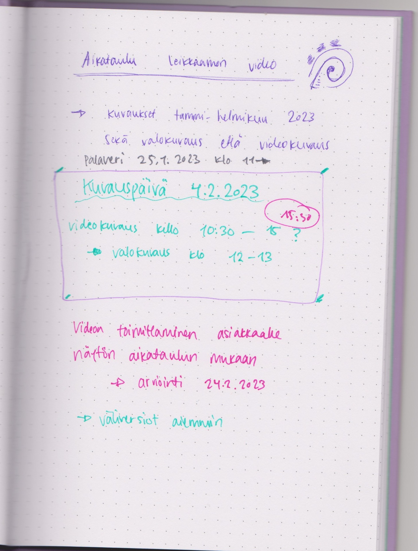 Iltapäivän palaverissa kävimme läpi rakentelemani idean, ja suomensin Hennalle kuvakäsikirjoitukseen piirtämiäni kuvia ja harakanvarpaita. Hennan mielestä alustava suunnitelma kuulosti hyvältä sekä videokuvauksen että valokuvauksen suhteen. Päätimme että sovimme varsinaisen kuvauspäivän aikataulun tarkemmin myöhemmässä vaiheessa, riippuen siitä, miten Henna saa sovittua mallit paikalle. Kuvauspäivänä huomioon täytyy ottaa se, että asiakas on tilannut meiltä myös valokuvausta, joten suunnittelemme aikatauluun sekä valokuvauksen ja videokuvauksen.