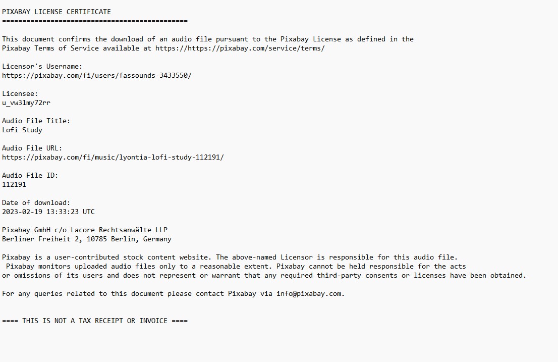 Kysyin asiakkaalta musiikkitoiveita, ja hän kertoi melko tarkkaan minkätyyppisen musiikin toivoo videoon tulevan. (Lo fi - musiikki, jouduin googlettamaan...) Musiikkivalinnan tekemisen pixabayn royaltyvapaasta valikoimasta delegoin Lauralle asiakkaan toivomilla spekseillä, ja hän heittikin kolme - neljä vaihtoehtoa, joista valitsin mielestäni asiakkaan toiveita vastaavan ja videon tyyliin sopivan musiikin.