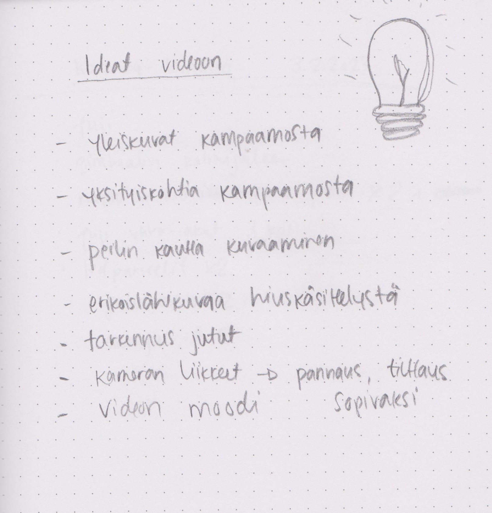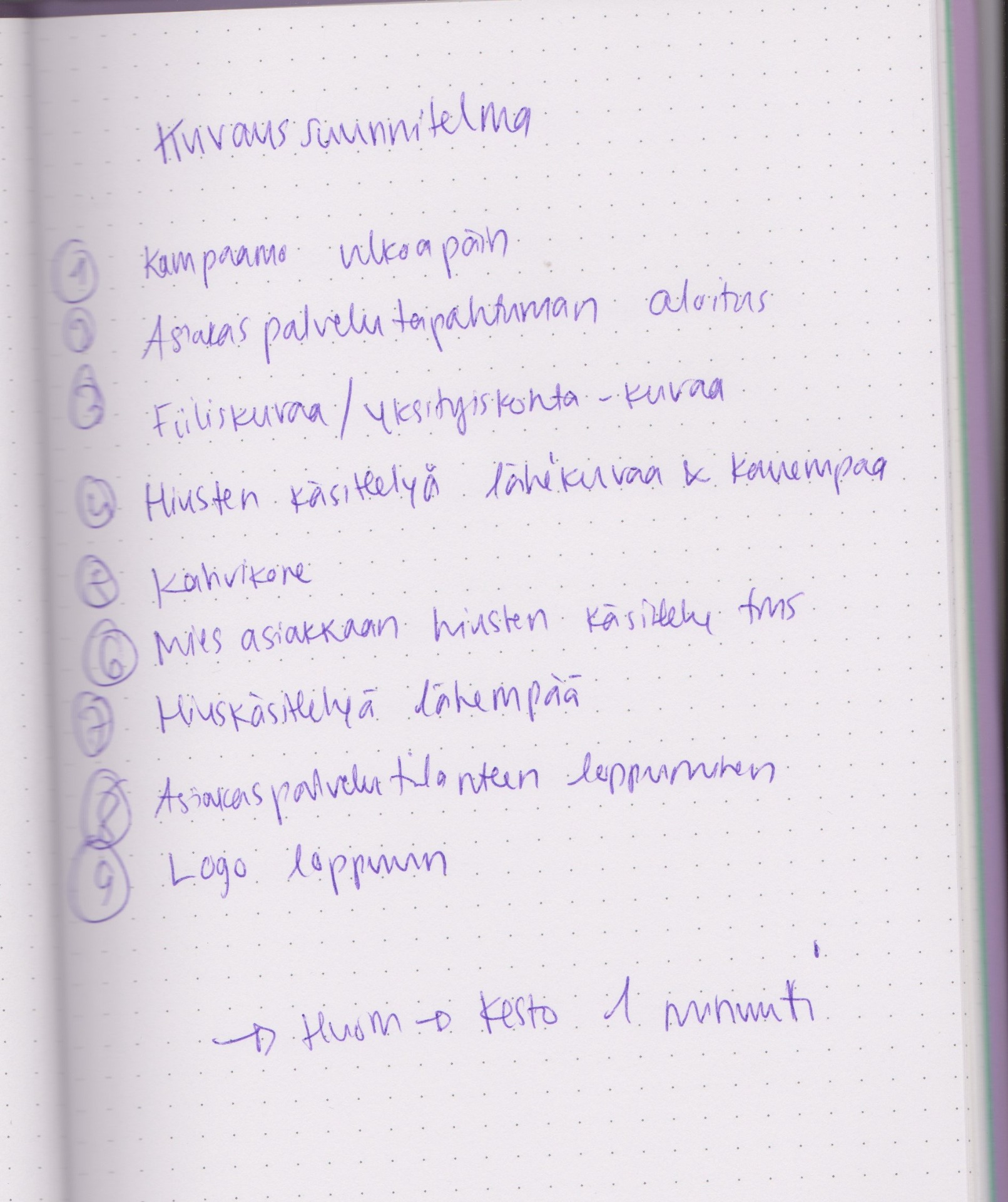 Ensimmäisen palaverin jälkeen suunnittelin videota kampaamon taukotiloissa kirjoittelemalla kuvausuunnitelman, ja hahmottelemalla ideoita kuvakäsikirjoitukseen. Suunnittelimme Lauran kanssa kuvakulmia ja mietimme loogisinta järjestystä asioiden esittämiseen. Katsoimme Hennan laittamat esimerkkivideot, ja päädyimme versioon joka olisi vähän kaikkien yhdistelmä: videolla etenisi yksi asiakaspalvelutapahtuma (hiustenleikkaus, värjäys, kampaus) ja samalla video esittelisi yleiskuvaa liiketilasta sekä sen yksityiskohtia.