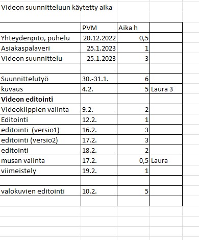Videon käyttötarkoitus: Mainoksena sekä infona nettisivuille ja someen. Koska videolle ei ole tarkoitus ostaa kaupallista mainostilaa (esim. televisio), sen pituutta ei ole tarpeen miettiä kustannusten kannalta. Päätimme kuitenkin, että video olisi noin minuutin mittainen, jolloin sen käyttö kokonaisuudessaan myös yrityksen somekanavissa on mahdollisimman helppoa.