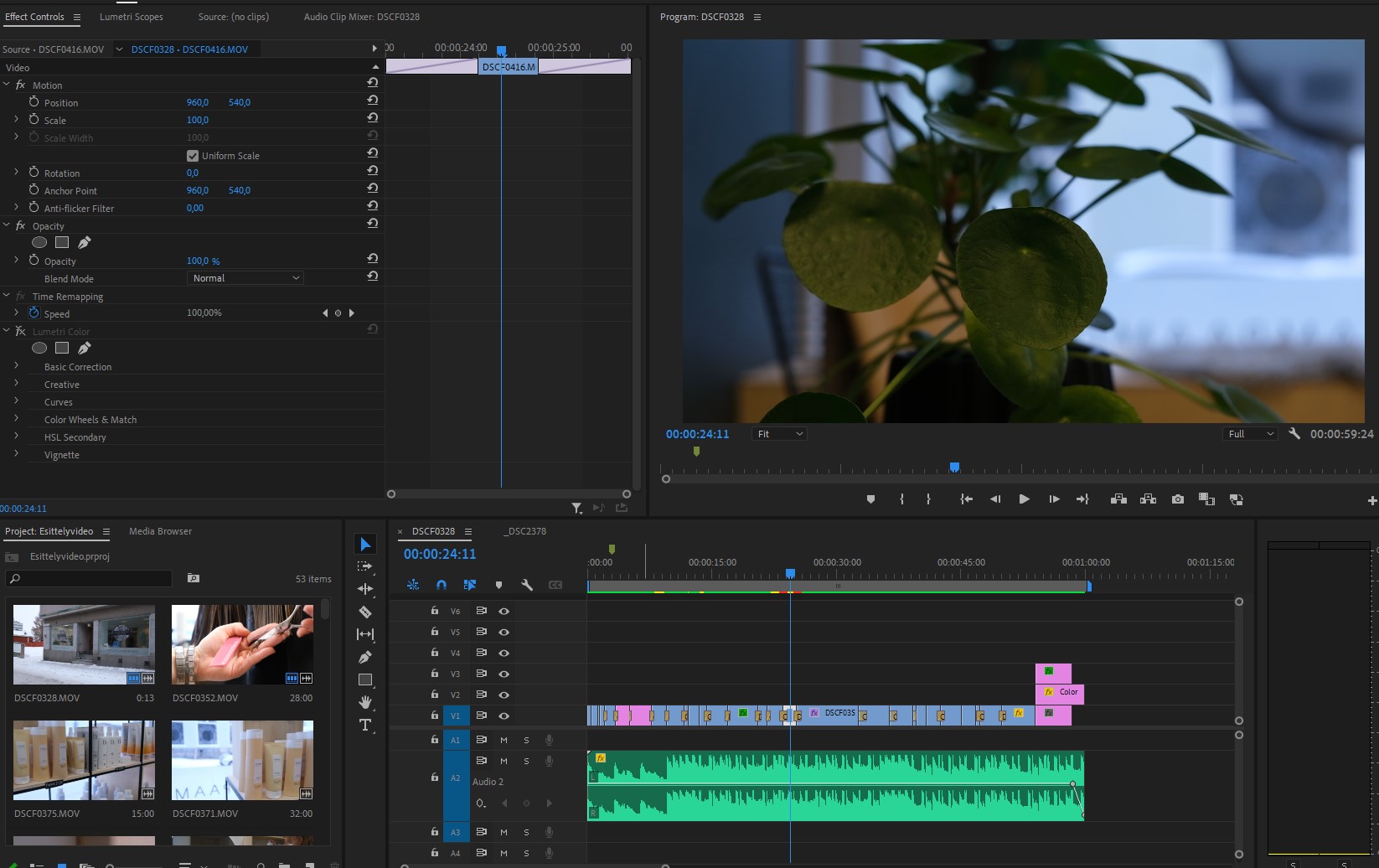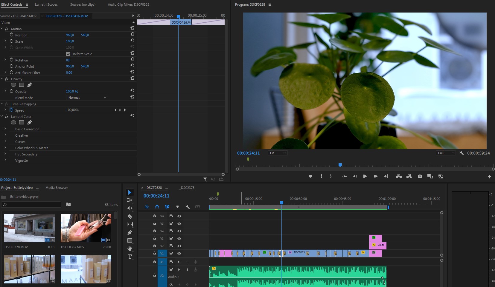 Loppujen lopuksi videoon tuli alkuperäisestä kuvakäsikirjoituksesta poiketen asiakkaan toiveesta enemmän lyhyitä yksityiskohtapätkiä ja tunnelmallista fiiliskuvaa. Olin kuvannut yksityiskohdista ns. varamateriaalia (B-roll) jota sitten premieressä lisäsin videolle sopiviin väleihin. Tätä materiaalia lupasin myös toimittaa Leikkaamolle myöhemmin muokarruna ja rajattuna pystyyn, käytettäväksi heidän somessaan, esim instastooreissa.